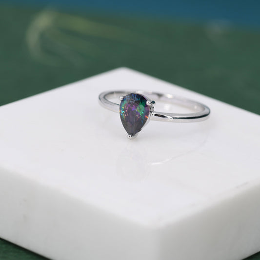 1 Carat Mystic Black CZ Pear Cut Ring in Sterling Silver, 5x7mm Mystic Topaz Zircon Ring, US Size 5-8, Aurora Black Droplet Ring