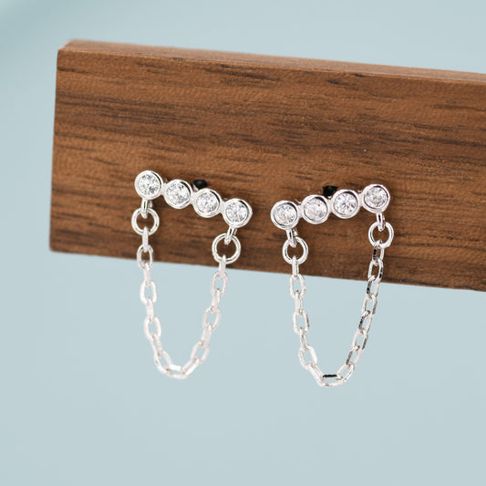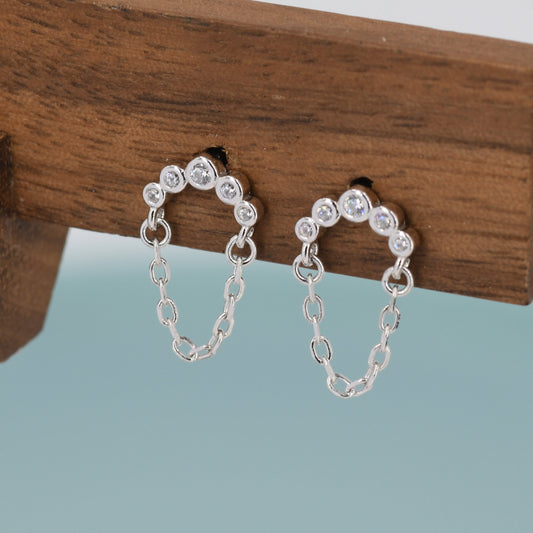 CZ Curved Bar Chained Stud Earrings in Sterling Silver, Silver, Gold or Rose Gold, Dangle Chain Earrings, Single Piercing