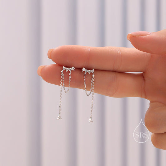 Curved CZ Bar Chained Stud Earrings in Sterling Silver, Silver, Gold or Rose Gold, Dangle Chain Earrings, Single Piercing