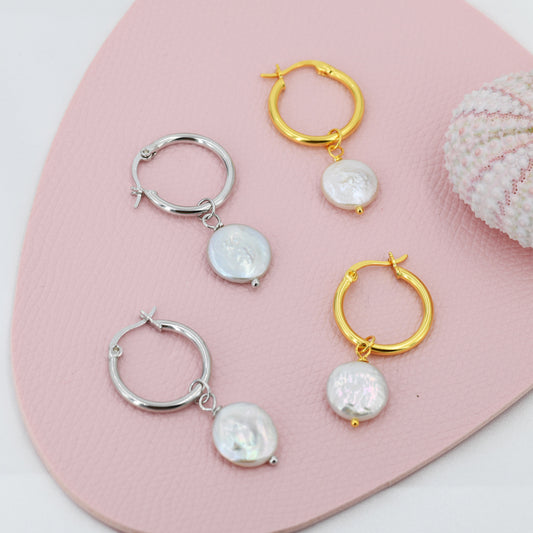 Coin Baroque Pearl Dangle Creole Hoop Earrings in Sterling Silver, Detachable Pearl Hoop Earrings, Pearl Huggie Hoops, Keshi Pearls