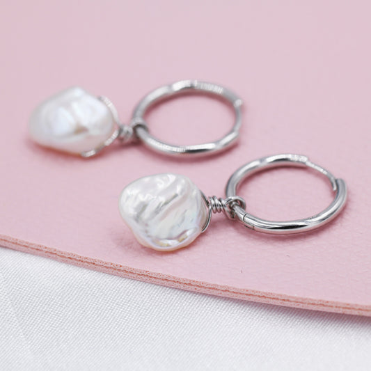 Irregular Shaped Baroque Pearl Dangle Hoop Earrings in Sterling Silver, Detachable Petal Pearl 12mm Hoop Earrings, Keshi Pearls