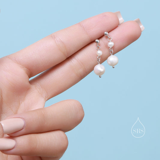 Genuine Freshwater Pearl Drop Earrings in Sterling Silver, Delicate Keshi Pearl Earrings, Double Pearl Stud Dangle Earrings