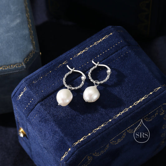 Baroque Pearl with Skinny Braided Hoop Earrings in Sterling Silver, Pearl Twisted Hoop Earrings, Pearl Huggie Hoops, Keshi Pearls