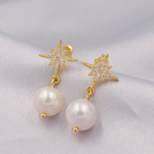 Starburst Star with Dangling Baroque Pearl Earrings in Sterling Silver, Keshi Pearl Drop Earrings, Genuine Freshwater Pearls