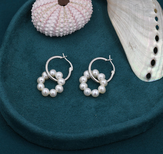 Pearl Wreath Hoop Earrings in Sterling Silver, Detachable Beaded Pearl Hoop Earrings, Pearl Charm Hoop Earrings, 14mm Hoops