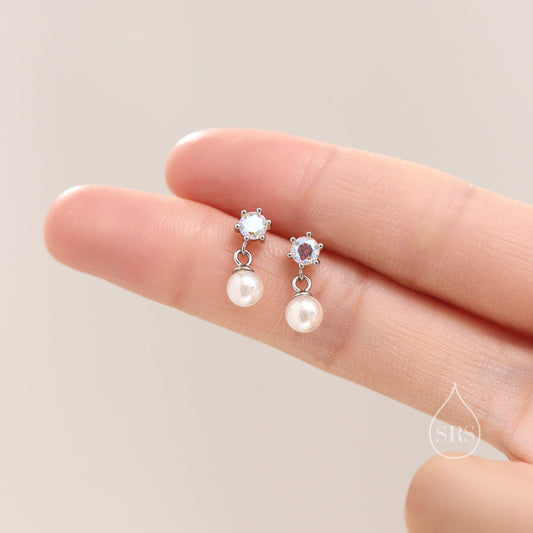 Aurora AB Crystal with Dangling Pearl Earrings in Sterling Silver, CZ and Pearl Drop Earrings, Lab Created Mother of Pearl Beads