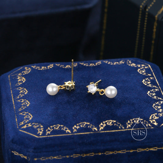 CZ Crystal with Dangling Pearl Earrings in Sterling Silver, CZ and Pearl Drop Earrings, Lab Created Mother of Pearl Beads