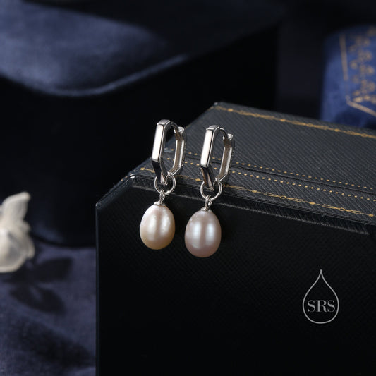 Natural Pearl Hoop Earrings in Sterling Silver, Genuine Pearl Huggie Hoops Chain Earrings, Pearl Dangle Hoops, Silver or Gold