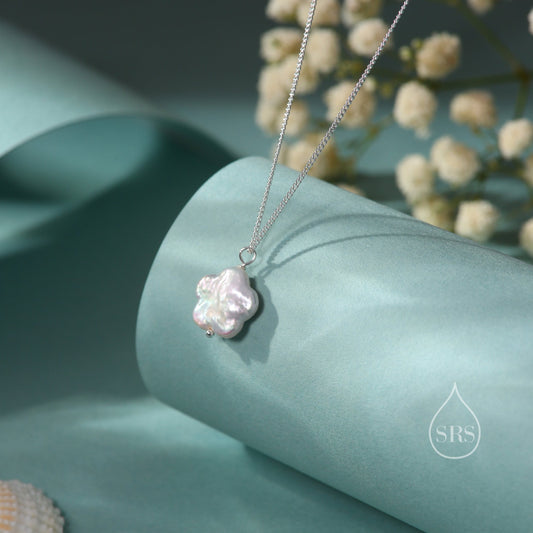 Genuine Flower Shape Baroque Pearl Pendant Necklace in Sterling Silver with Curb Chain, Keshi Pearl Flower Shape Necklace, Silver or Gold