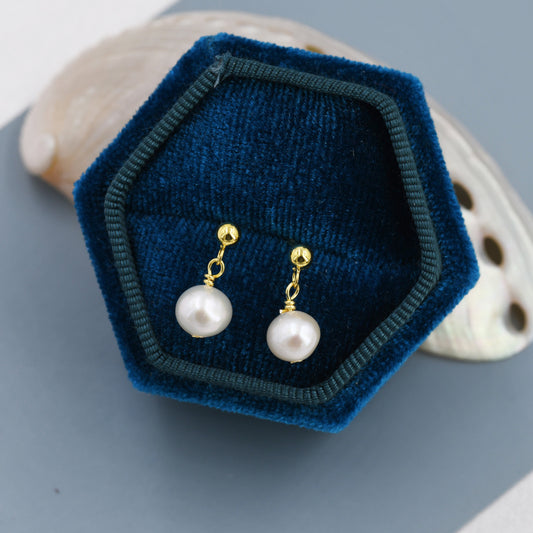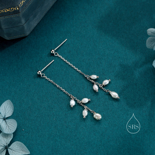 Genuine Freshwater Pearl Drop Earrings in Sterling Silver, Tiny Oval Pearl Long Dangle Earrings, Pearl Stud Dangle Earrings, Silver or Gold