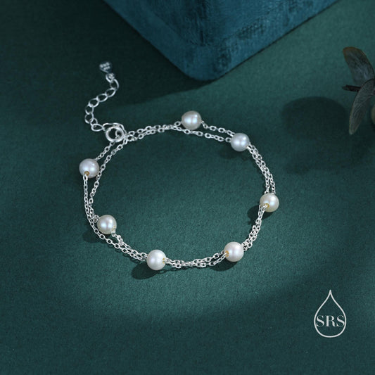 Sterling Silver Double Layer Natural Pearl Beaded Bracelet, Silver or Gold, Real Freshwater Pearls, Natural Pearl Bracelet, Bridal Jewellery
