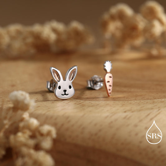 Mismatched Rabbit and Carrot Stud Earrings in Sterling Silver with partial rose gold, Asymmetric Cute Bunny and Carrot Earrings