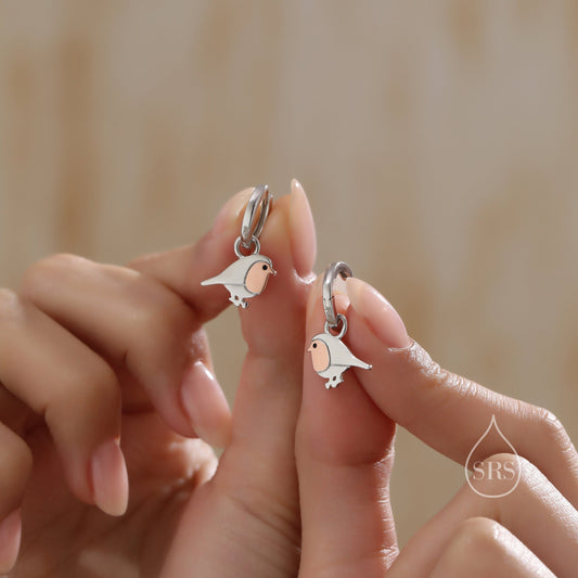 Sterling Silver Robin Bird Dangle Huggie Hoops, Two Tone Robin Hoop Earrings, Dainty Dangle Earrings, Robin Bird Earrings, Robin Earrings