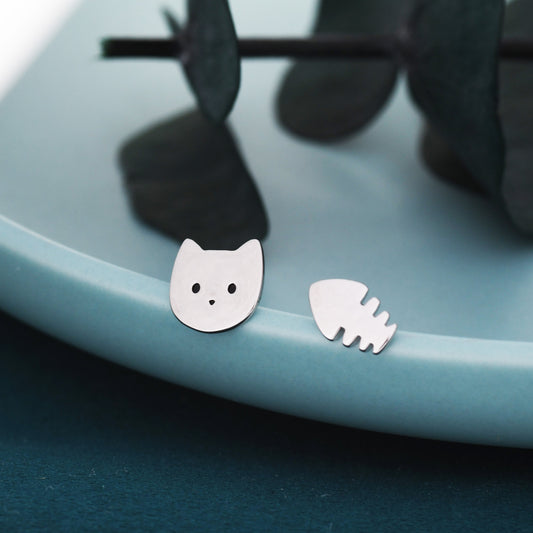 Mismatched Cat and Fishbone Stud Earrings in Sterling Silver, Asymmetric Cat and Fish Earrings, Cute Cat Lover Earrings