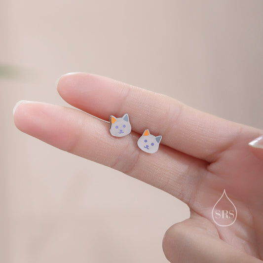 Sterling Silver Calico Cat Enamel Stud Earrings, Silver Cat Earrings, Black and White Cat Earrings, Tiny Cat Stud, Cute Kitty Stud Earrings