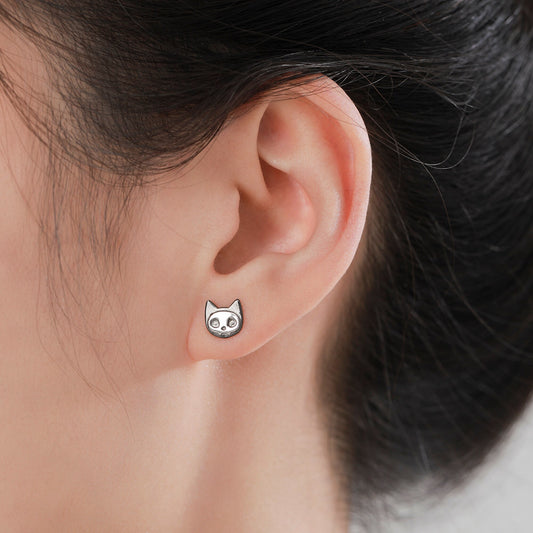 Cute Cat Skull Stud Earrings in Sterling Silver, Black Rhodium Partial Coated, Black Cat Stud Earrings in Sterling Silver