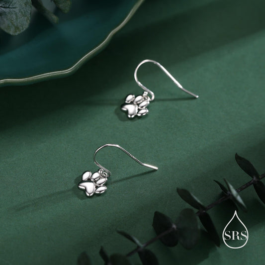 Paw Print Drop Hook Earrings in Sterling Silver, Silver or Gold or Rose Gold, Pet Earrings, Dog Earrings, Cat Earrings