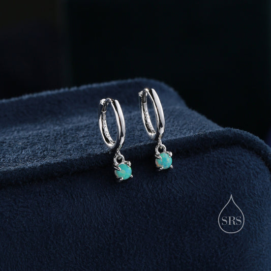 Sterling Silver Dangling 4mm Opal Hoop Earrings, Blue Opal or Fire Opal Charm Dangle Hoop Earrings, Silver or Gold