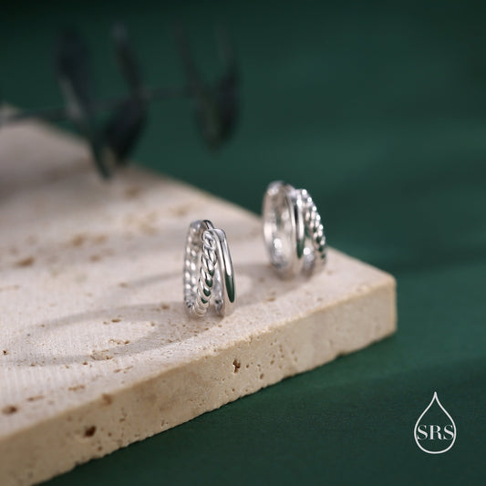 Single Piercing Double Hoop Effect Earrings in Sterling Silver with Braided Details, Rope Hoop Earrings, Silver, Gold, Rose Gold,