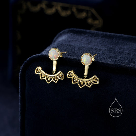 Fire Opal Lotus Ear Jacket in Sterling Silver, Lab Opal Lotus Jacket Earrings in Sterling Silver, Silver or Gold, Front and Back