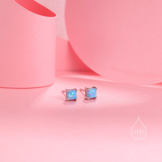 Blue Opal Square Stud Earrings in Sterling Silver - Gold or Silver - Opal Cube Earrings - Petite Stud Earrings, Blue Opal, Square Shape