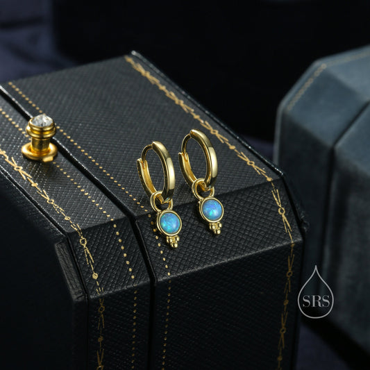 Vintage Inspired Blue Opal Charm Hoop Earrings, Dotted Fire Opal Dangle Hoop Earrings, Silver or Gold, Detachable and Interchangeable Charm