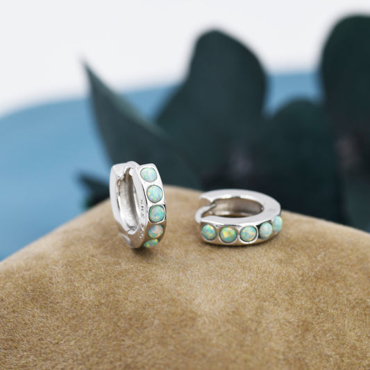 Opal Trio Droplet Tiny Huggie Hoop Earrings in Sterling Silver, Blue Opal or White Opal or Purple Opal or Green Opal, Three Opal Earrings