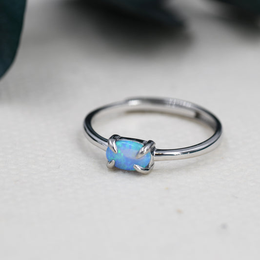 Clawed Blue Opal Oval Ring in Sterling Silver, Adjustable Size Opal Ring, Prong Set, Lab Opal Stone Ring, Opal Ring, Delicate Stacking Ring