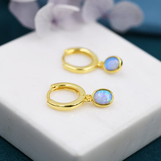 Sterling Silver Dangling Oval Blue Opal Hoop Earrings, Blue Opal Charm Dangle Hoop Earrings, Silver or Gold