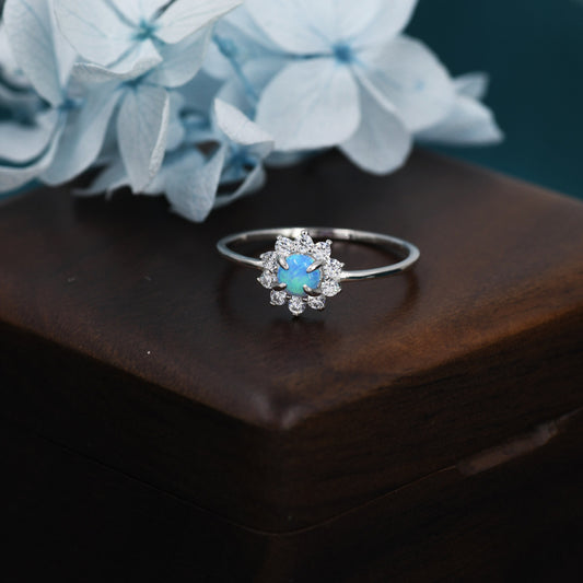 Blue Opal CZ Halo Ring in Sterling Silver, US 5 - 8, 4x6mm, Lab Opal Stone Ring, Blue Opal Ring