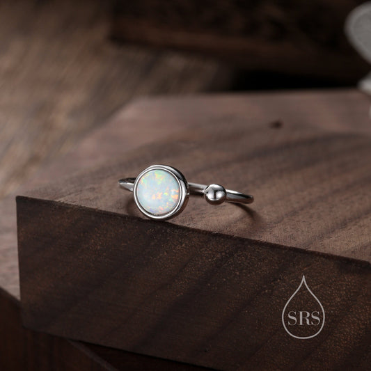 White Opal Open Ring in Sterling Silver, 6mm Lab Opal Stone, Bezel Set Simulated Fire Opal Ring, Adjustable Size
