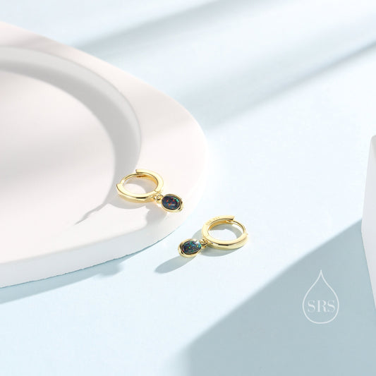 Sterling Silver Dangling Oval Black Opal Hoop Earrings, Lab Created Black Opal Charm Dangle Hoop Earrings, Silver or Gold
