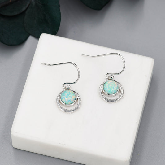 Aqua Green Opal and Circle Drop Hook Earrings in Sterling Silver, Delicate Fire Opal Geometric Earrings, Opal Coin Earrings