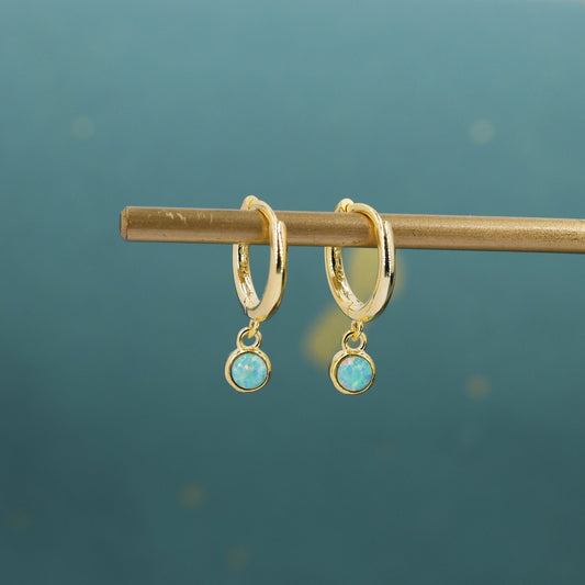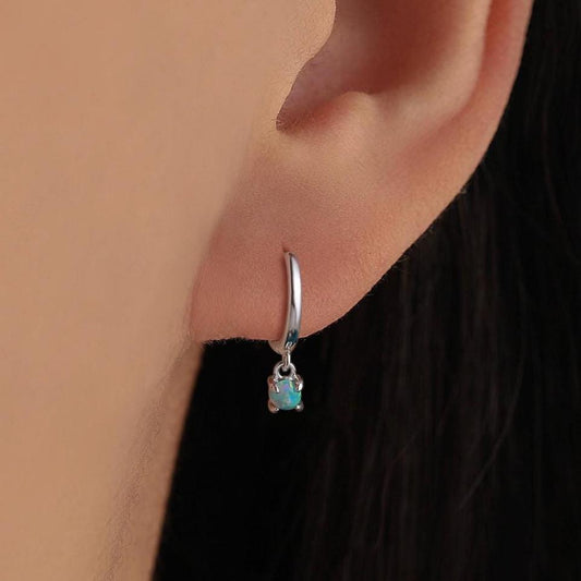 Green Opal Dot Dangle Huggie Hoop Earrings in Sterling Silver, 4mm Tiny Opal Prong Set Hoops, Opal Hoops, Fire Opal Hoops