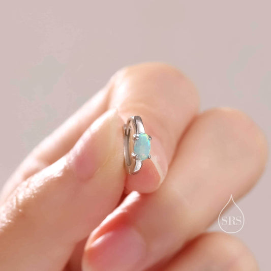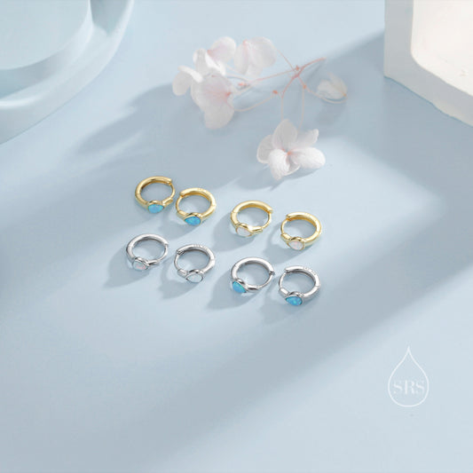 Delicate Opal Droplet Huggie Hoop Earrings in Sterling Silver, Silver or Gold, Blue or White Pear Shape Opal, Tiny Opal Hoop Earrings