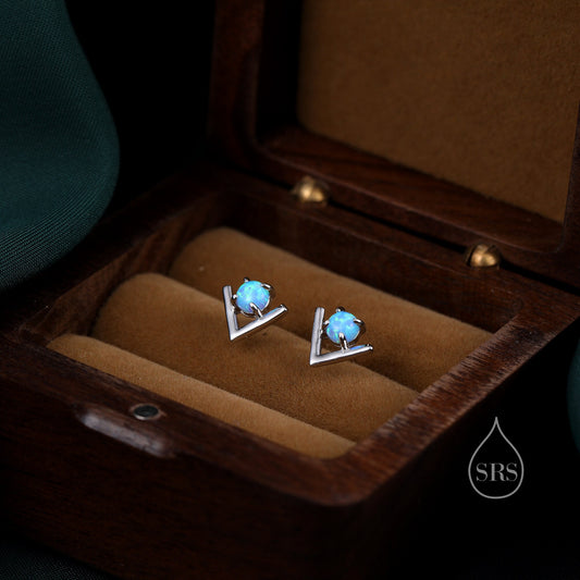 Sterling Silver Blue Opal Chevron Stud Earrings, V shape Opal Earrings, Geometric Opal Earrings, Lab Opal Studs