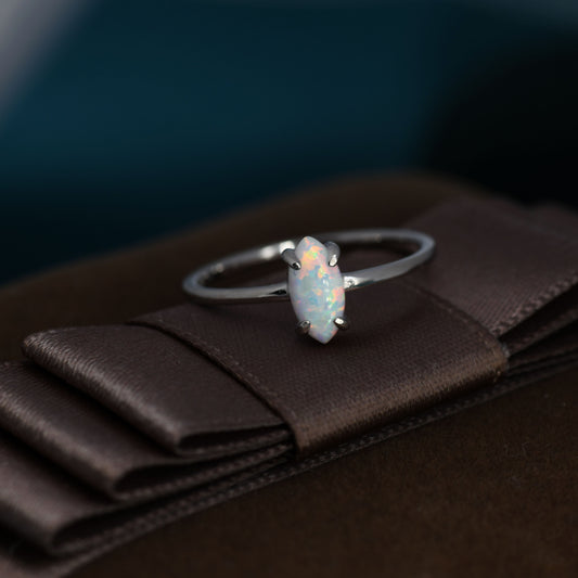 Fire Opal Marquise Ring in Sterling Silver, US 5 - 8, Single Opal Marquise Ring, Silver Opal Ring, Lab Opal Stone Ring, White Opal Ring