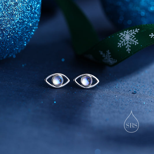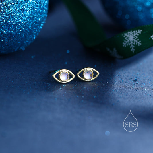 Moonstone Eye Stud Earrings in Sterling Silver, Opal Eye Earrings, Silver or Gold, Evil Eye Earrings, Blue Opal Eye Earrings