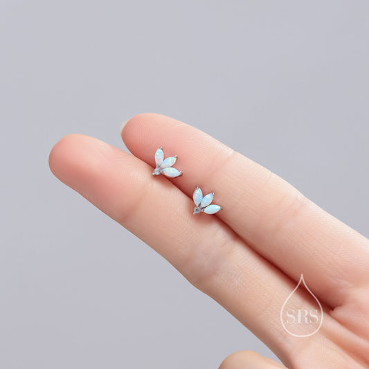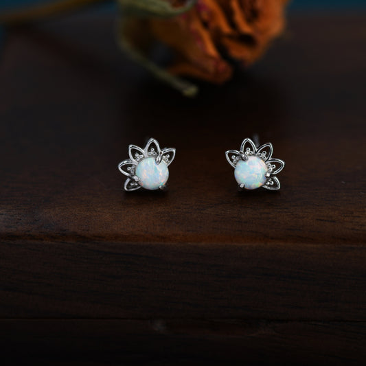 Sterling Silver White Opal Crown Stud Earrings, Prong Set, Opal Earrings, Lab Opal Lotus Earrings, Minimalist