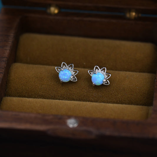 Sterling Silver Blue Opal Crown Stud Earrings, Silver and Gold, Prong Set, Opal Earrings, Lab Opal Lotus Earrings, Minimalist