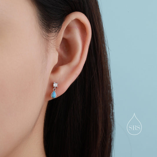 Tiny Opal Dangle Stud Earrings in Sterling Silver with Round CZ and Droplet Opals, Silver or Gold, White Opal or Blue Opal