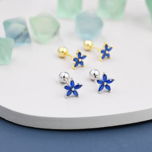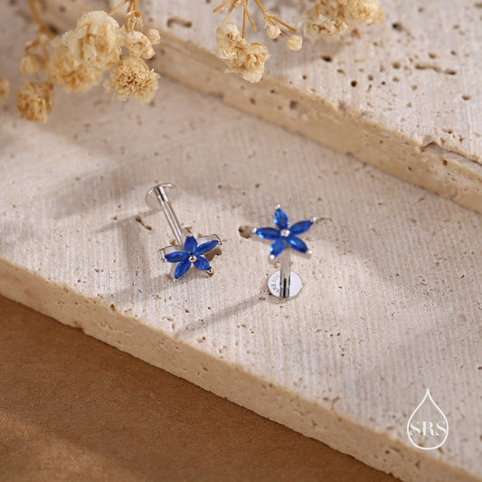 Tiny Sapphire Blue CZ Flower Internally Threaded Flat Back /Screw Back/ Stud Earrings in Sterling Silver, Silver or Gold or Rose Gold