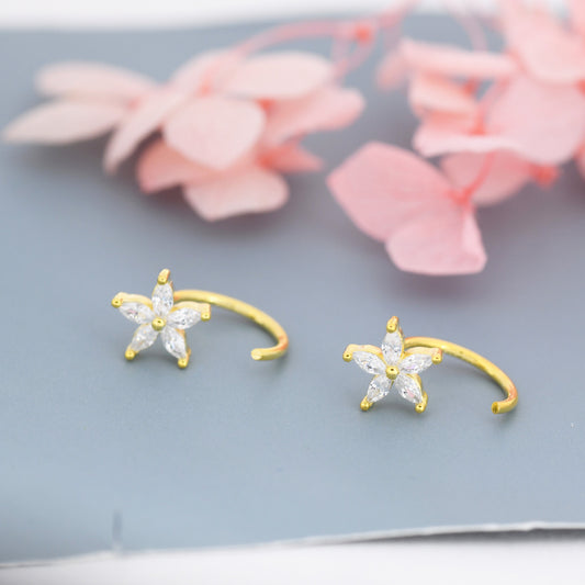 CZ Forget-me-not Flower Huggie Hoop Earrings in Sterling Silver, Gold or Silver, Marquise CZ Flower Threader Hoop Earrings, Pull Through
