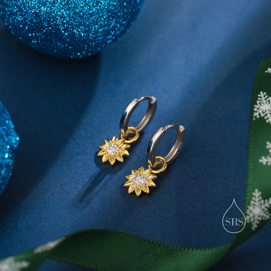 Sterling Silver Sunflower Huggie Hoops, Dainty Dangle Sunflower Earrings, Flower Hoops, Detachable and Interchangeable Hoops