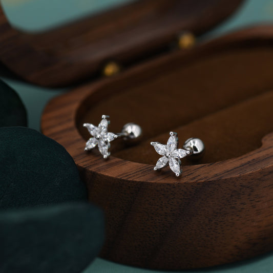 Sterling Silver CZ Flower Barbell Earrings, Gold or Silver, Marquise CZ Screw Back Earrings, Stacking Earrings