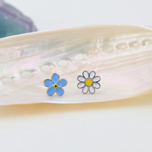 Mismatched Enamel Daisy and Forget Me Not Flower Stud Earrings in Sterling Silver, Asymmetric Forget me not and Daisy Flower Earrings,
