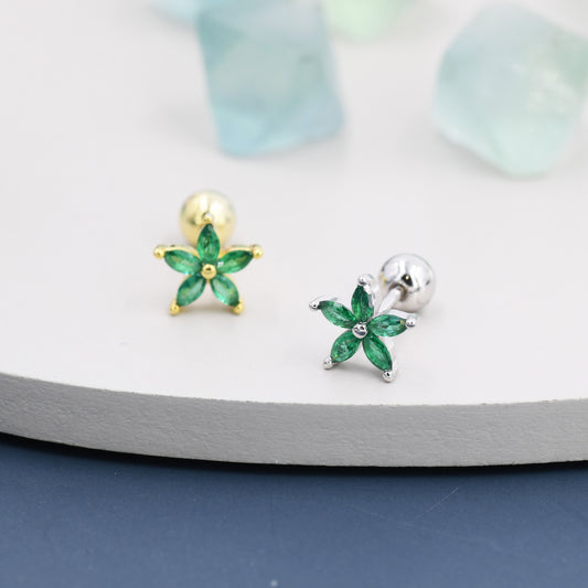Emerald Green CZ Flower Internally Threaded Flat Back Earrings/ Screw Back /Stud Earrings in Sterling Silver,