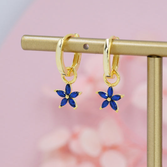 Sapphire Blue Flower CZ Huggie Hoop in Sterling Silver, Silver or Gold, Minimalist Simple Hoop Earrings, Detachable and Interchangeable