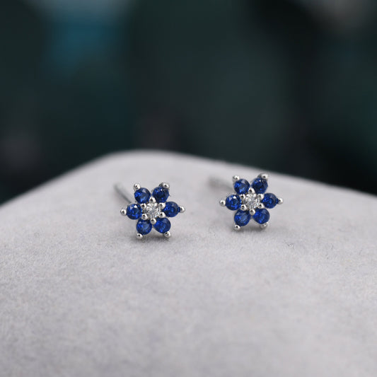 Very Tiny Sapphire Blue CZ Flower Stud Earrings in Sterling Silver, Silver or Gold, Crystal Flower Earrings, Stacking Earrings