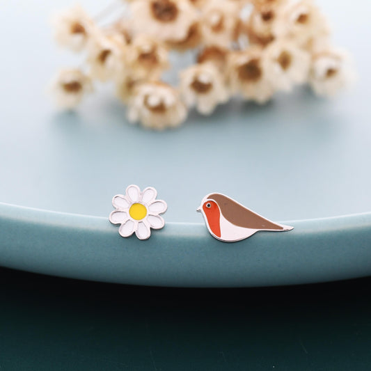 Mismatched Enamel Daisy and Robin Bird Stud Earrings in Sterling Silver, Asymmetric Robin Bird and Daisy Flower Earrings,